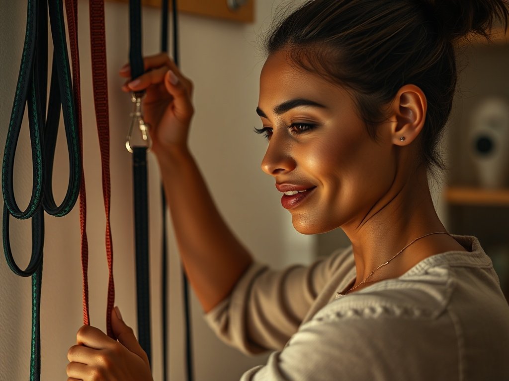 This cozy corner features a plaid dog bed, ceramic bowls, and chew toys, with wall-mounted leash hooks to keep everything organized. It’s a perfect blend of comfort and convenience for your furry friend.