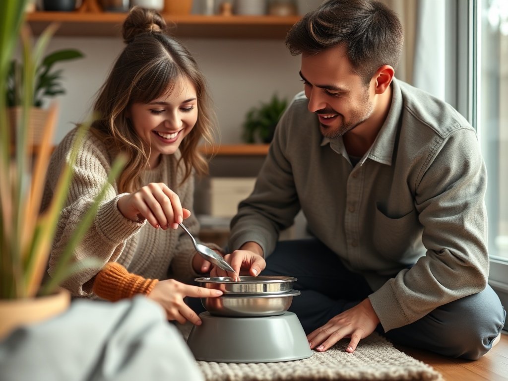 This cozy corner features a corduroy dog bed and ceramic water and food bowls, creating a comfortable and stylish space for your pet.
