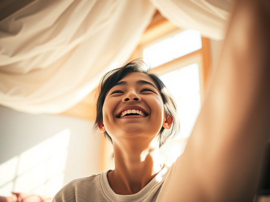 Create a serene and airy atmosphere with a minimalist grey and bamboo lofted bedroom featuring a skylight. This design maximizes natural light and space efficiency.