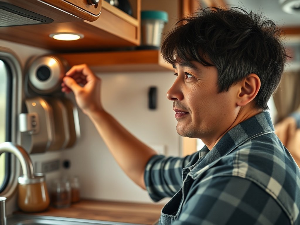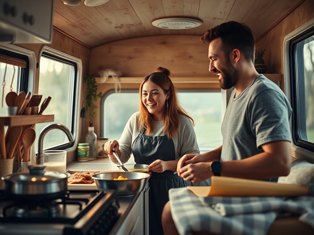 With wood-paneled interiors and a visible kitchenette section, this setup maximizes every inch. Add a touch of elegance with a compact stainless steel kettle for your tea or coffee breaks. Additionally, upgrade with a Pop-Up Collapsible Dish Drying Rack, a Magnetic Knife Strip, and Under-Cabinet Lighting to enhance functionality.