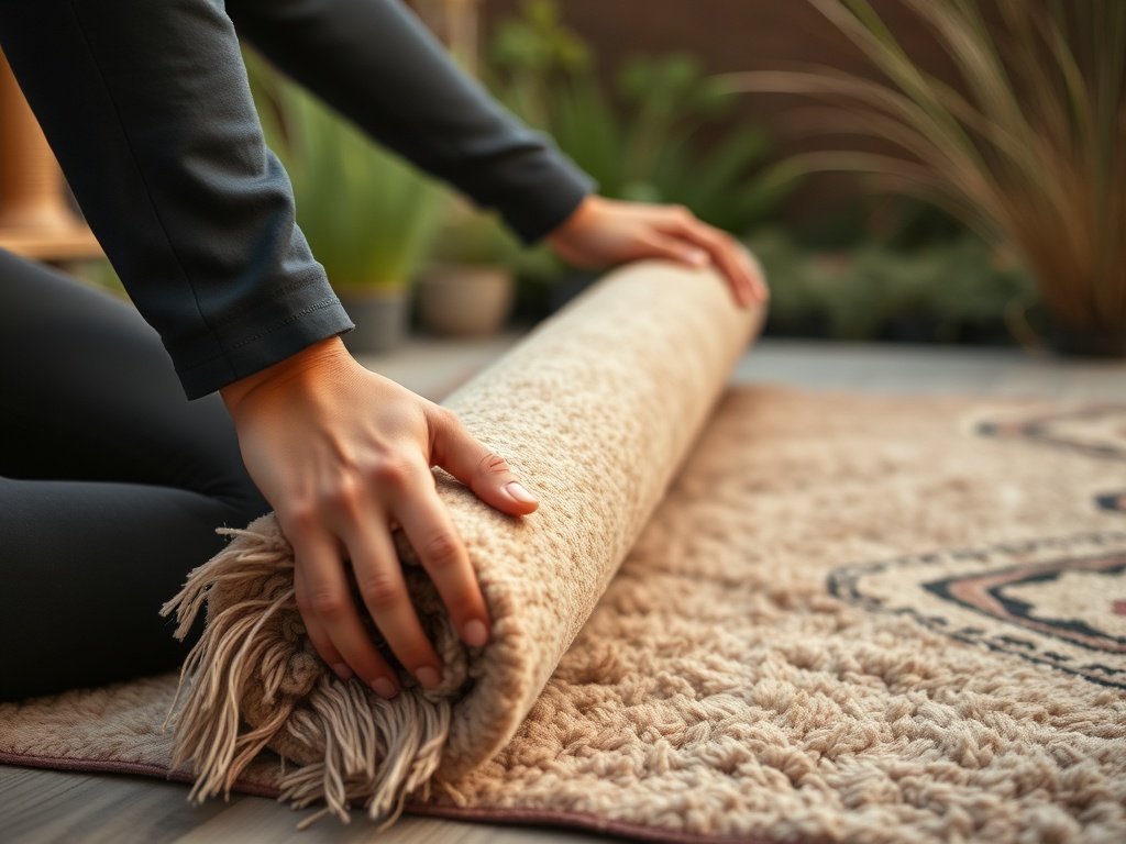 Enhance your yoga practice with a large russet rug and Tibetan yoga mats under twilight ambient lighting. This setup offers a peaceful and focused environment for yoga enthusiasts.