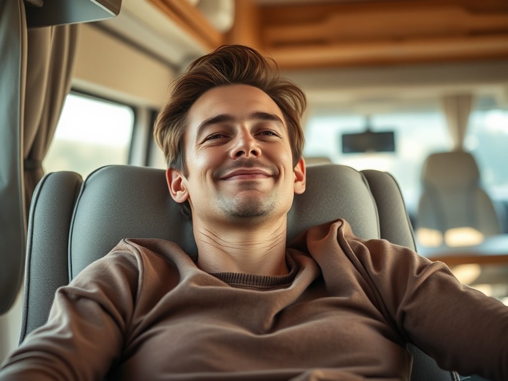 This RV’s hardwood pull-out desk with an ergonomic chair faces a panoramic window, providing a perfect workspace. The warm LED lights overhead, large cozy sofa, fully functional compact kitchen, and memory foam queen-size bed tucked under loft-style shelves make this setup both comfortable and efficient.
