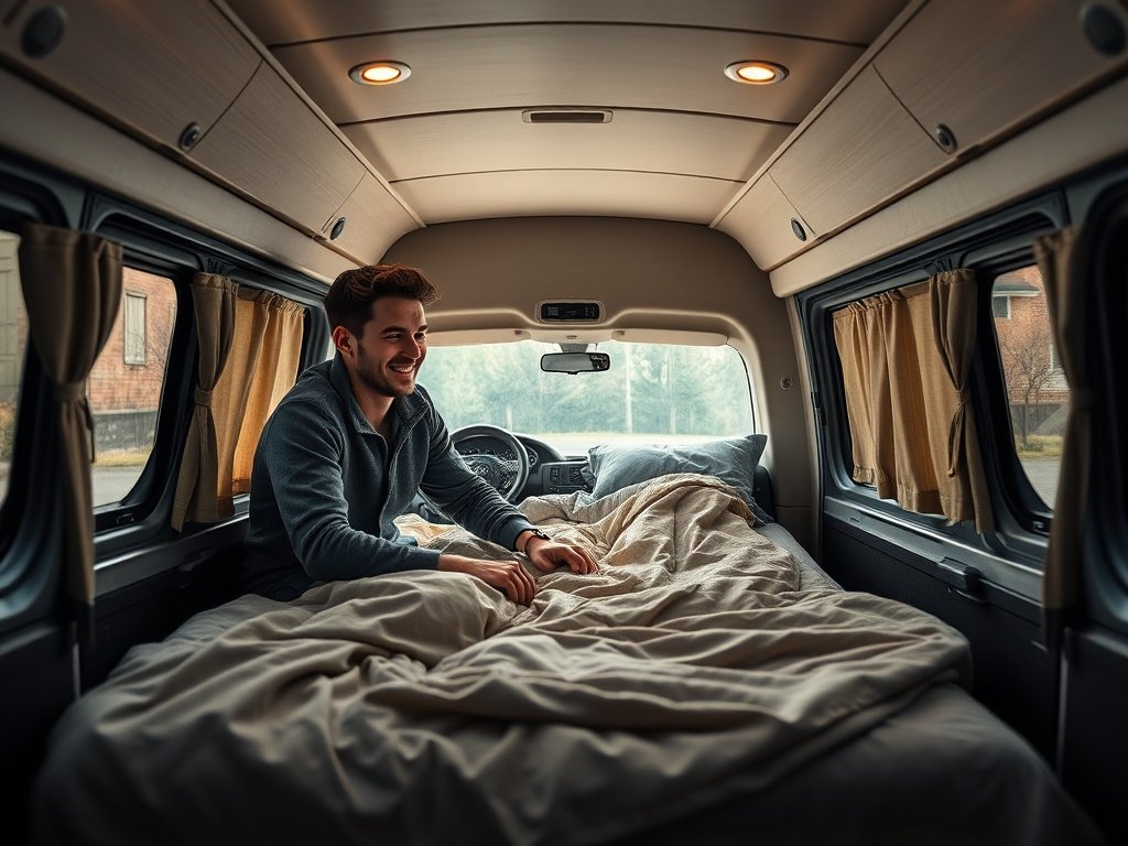 This cozy van bed is surrounded by floor-to-ceiling wood and hanging spider plants, offering a warm and natural retreat.