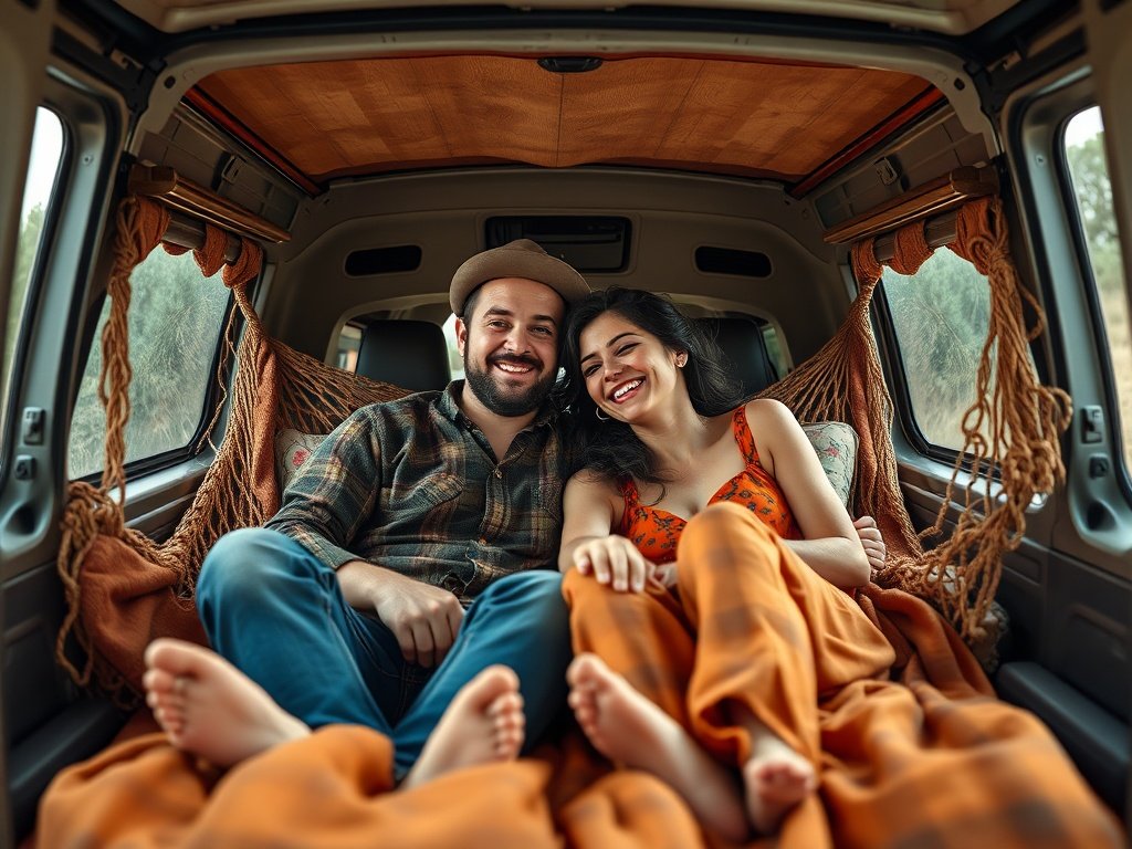 A hammock hung over beechwood Bohemian style rugs creates a cozy and inviting space in this modern camper van. The mix of textures and natural elements brings a touch of the outdoors inside, perfect for a nomadic lifestyle. To enhance the bohemian vibe, consider adding a few macramé plant hangers and a set of colorful throw pillows.