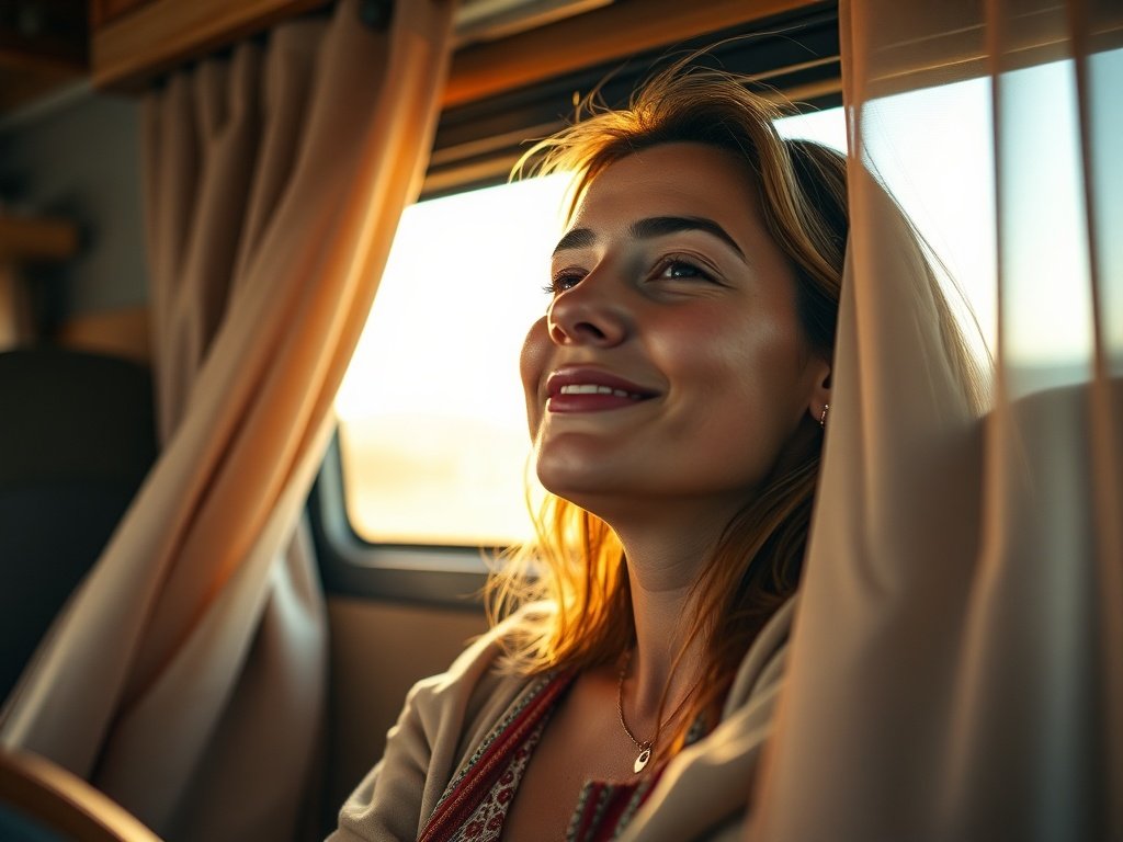 Wooden accents paired with white linen drapes create a bright and airy atmosphere in this camper van. The light colors and natural materials make the space feel larger and more inviting. Complete the look with some bohemian-style throw pillows and a few vintage-inspired decor pieces.