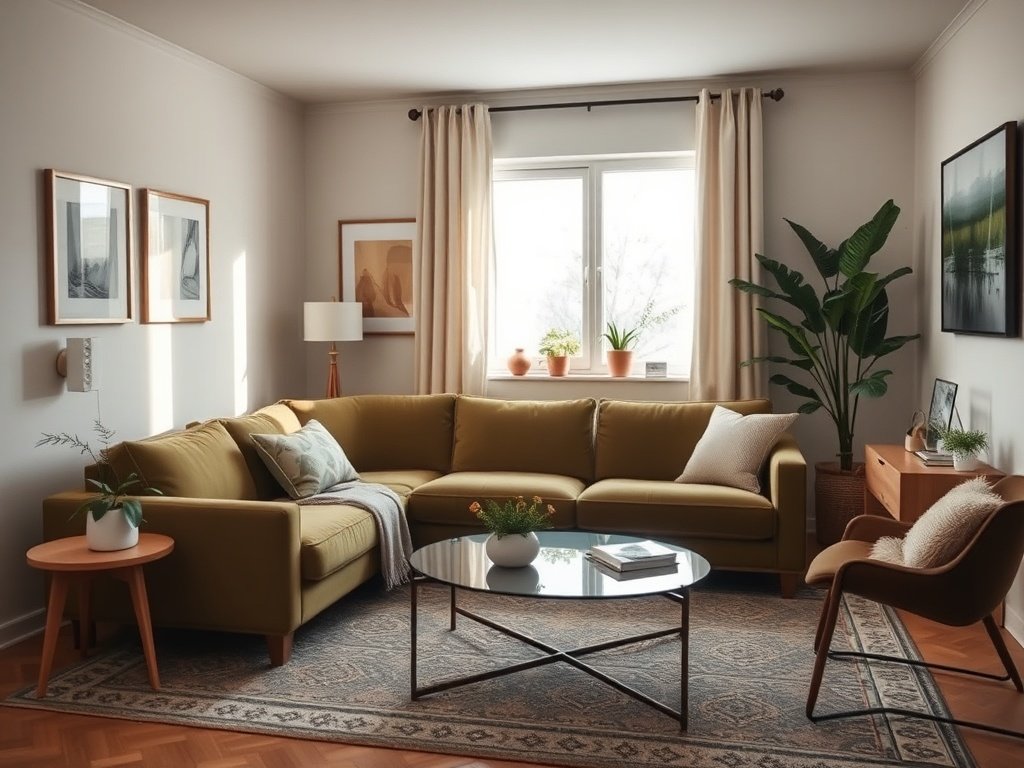 How a 77″ Olive Green Camel-Back Velvet Sofa Can Make a Tiny Living Room Feel Intentionally Maximalist