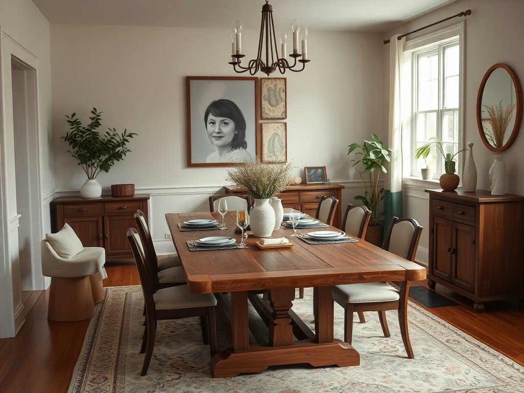 Instead of trying to fix every corner at once, start with the table. A solid wood farmhouse table gives the room a clear focal point, which makes the whole space feel more intentional almost immediately.