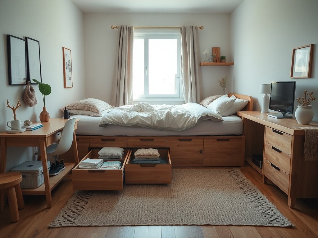 Make a cramped dorm feel 2x calmer with one queen bed frame that adds storage and style