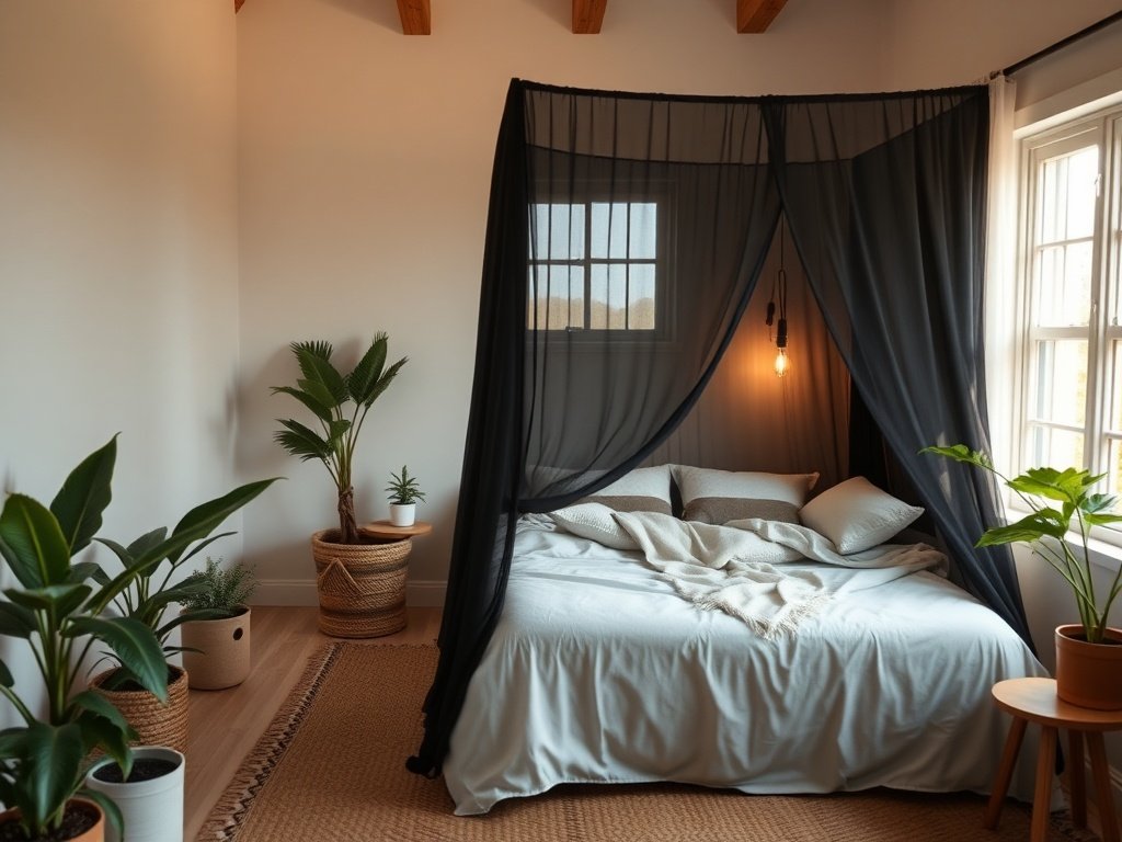 Turn a tiny tropical bedroom into a moody bungalow retreat with one black canopy layer