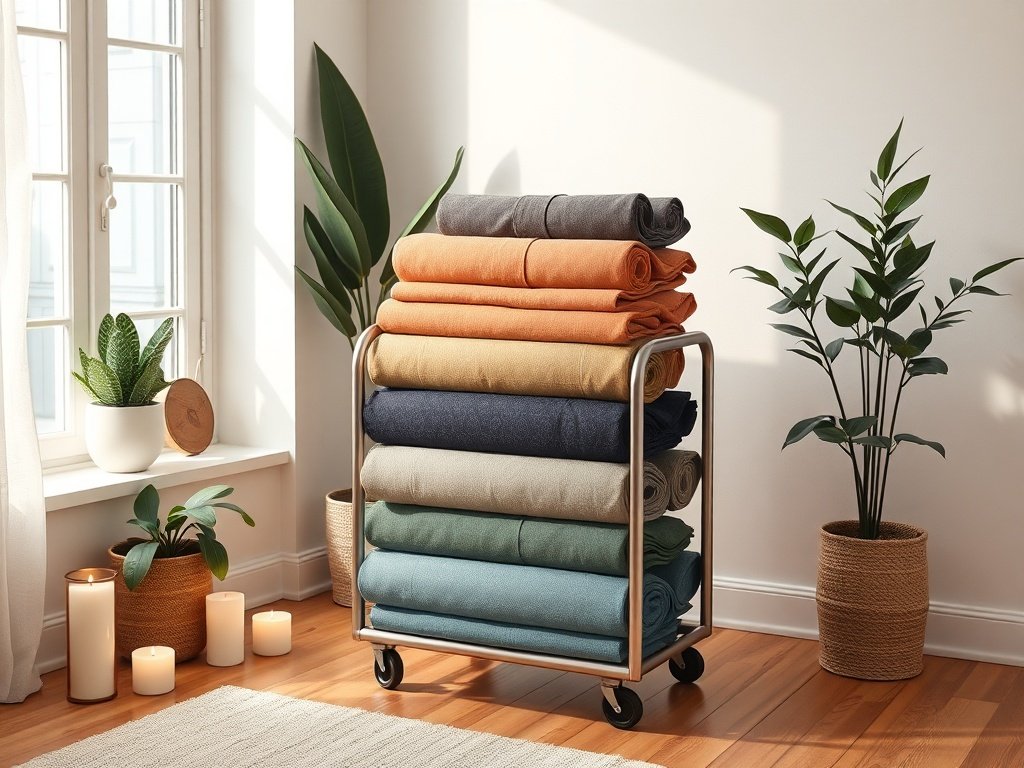 Turn yoga clutter into a calm studio corner with a rolling cart that stores up to 20 mats